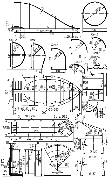 Дейдвуд мотора полностью сварной и включает выхлопной тракт и кожух торсионного вала. Верхний фланец дейдвуда полностью соответствует верхнему фланцу серийной дейдвудной трубы мотора и при изготовлении размечается по нему. Выхлопной тракт коробчатый прямоугольной конструкции сварен из листовой стали толщиной 1 мм. Для увеличения жесткости стенок на них можно сделать вертикальные гофры или изнутри приварить ребра жесткости. Снизу дейдвудной трубы приварен фланец для соединения на болтах с фланцем водометного движителя. Водовод сварен из двух симметричных половинок, вытянутых вручную из стального листа толщиной 1 мм в песчано-цементных матрицах. Сварку половинок нужно делать на болване, по которому изготавливались матрицы, обжав водовод хомутами. Детали рабочего колеса, водовода и спрямляющего аппарата приведены на рис. 58.