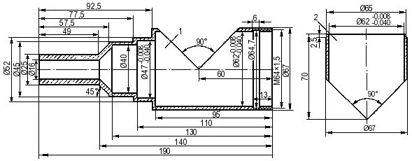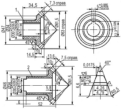 Шестерни (рис. 59) изготовляются из углеродистой цементируемой стали Ст10 или Ст20 и до цементации и закалки прикатываются до получения удовлетворительного пятна контакта при проверке на краску. Характеристики зацепления: тип зуба прямой; число зубьев — 19; модуль — 3; коэффициент смещения исходного контура — 0; угол делительного конуса — 45°; угол конуса впадин — 39°54'.