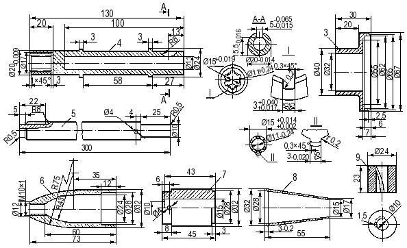 Регулировка зазора в зацеплении производится шайбами, устанавливаемыми под крышку корпуса редуктора и переднюю крышку угловой передачи. Контроль и проверка правильности зацепления производится через патрубок, служащий и для заливки масла. Применение любителями для изготовления шестерен легированных сталей нецелесообразно из-за сложности термообработки. Горизонтальный вал редуктора пустотелый и связан с гребным валом внутренним шлицевым соединением. Задний конец вала опирается на подшипник №204 и в месте выхода в полость водовода уплотнен двумя резиновыми манжетами 40×20×9. Детали механической передачи изображены на рис. 60.