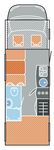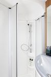 Модель автодома Carado А464 рассчитана на одновременное путешествие 4-6 человек. Стационарных спальных мест здесь шесть: два - в алькове, два - в задней части пассажирского отсека, а также небольшая двуспальная кровать (180х100 ммм) получается путём трансформации столовой группы. За столом можно находиться и в пути: здесь все четыре сиденья оборудованы ремнями безопасности. А кровать в алькове складывается, что дополнительно увеличивает объём жилого пространства. Кухня располагается слева от входа, напротив столовой группы. Душевая кабина находится между столовой и задним спальным отсеком.