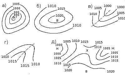 Рис. 135.Основные формы барического рельефа: а - циклон; б - антициклон; в - ложбина; г - гребень; д - седловина.
