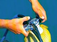 После заправки баллонов на гнезда вентилей надеваются защитные колпачки или наклеивается липкая лента — это означает, что баллоны заправлены. Снимите то или другое и на мгновенье приоткройте вентиль, чтобы продуть его и очистить от волы и пыли. Проверьте кольцевую прокладку соединения вентиля и регулятора на возможное наличие засечек, проведите по ней мокрым пальцем, чтобы удалить кристаллы соли или волоски — так вы обеспечите герметичность соединения. Снимите защитный колпачок с первой ступени регулятора и наденьте переходник на горловину вентиля. Убедитесь в правильной ориентации переходника и его соответствии размеру выточки вентиля. Маховик переходника или фитинг типа DIN туго затяните рукой.