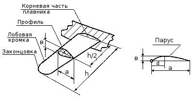 Рис. 12.1. Геометрические параметры плавника, паруса и их профилей (сечений): а — хорда; в — толщина; h — высота паруса (глубина плавника); в/а — полнота профиля («пузо» паруса); h/a — удлинение (определяется для «а» при h/2); a/d — «лобастость» профиля («пуза»)