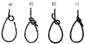 Конец троса проводят в колышку (рис. 13 б), обносят вокруг коренной части троса и снова пропускают в колышку, но в обратном направлении (рис. 13 в). Затянутый узел изображен на рис. 13 г.