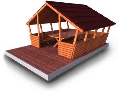 Каркас и обшивка беседки выполнена из дерева хвойных пород, в качестве кровли используется мягкая черепица.