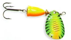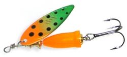 С 2008 года приманка обрела новые очень привлекательные окраски. Так любимые нами зеленоватые и золотистые. Особенно актуальны эти цвета при ловле окуня, стоящего на нижних горизонтах. Например, при затухании его котловой активности. Именно в такие моменты он часто хорошо реагирует на вертушку медленно идущую в придонном слое Еще ею можно очень хорошо половить жереха, ибо приманка очень дальнобойная.