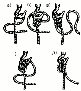 Ходовой конец троса (буксира) закрепляют линем или шкимушгаром (рис. 26 д).