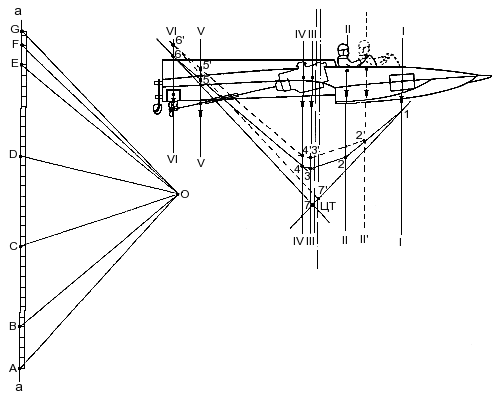 Для этого на прямой а-а откладываются (в порядке размещения на судне) отрезки AВ — вес бака с горючим; ВС — вес водителя; CD — вес корпуса; DE — вес двигателя; EF — вес валопровода и рулевого устройства; FG — вес запчастей. Полюс О можно расположить на произвольном расстоянии от диаграммы весов; нужно только учитывать, что полюсное расстояние должно быть таким, чтобы углы пересечения линий с вертикалью (диаграммой) не были излишне острыми и не снижали точность построения.