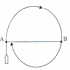 Катер на заданном ходу пересекает под прямым углом (90°) створ АА1. В момент пересечения створа руль перекладывается право на борт, включается секундомер и секстаном измеряется горизонтальный угол а, между створом и знаком Б. При повороте катера на 180° и пересечении им створа АА1 на обратном курсе останавливается секундомер и измеряется угол. Показания секундомера будут соответствовать времени так называемой неустановившейся циркуляции, т.е. поворота катера на 180° (половина полной циркуляции). Для определения диаметра циркуляции берется крупномасштабная карта (план), отложив на которой измеренные углы α и α2 наносятся точка М1 и точка М2 Расстояние между этими точками и есть диаметр циркуляции. С достаточной точностью диаметр циркуляции можно определить и без измерения углов секстаном. Для этого в моменты пересечения створа АА1 за борт бросаются легкие вехи или буйки, а затем при помощи линя измеряется расстояние между ними. Это расстояние и принимается за диаметр циркуляции.