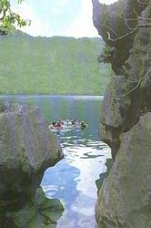 Дайвер спускается к озеру Каянган, питаемому горячим источником. Все снаряжение приходится нести с собой