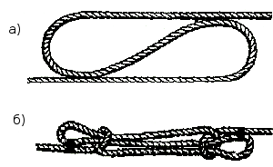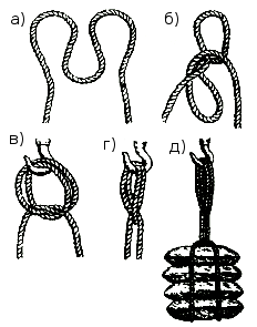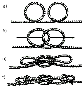 Затем узел затягивают и на каждую из его петель накидывают по одному полуштыку. Петли узла крепят к коренной части троса каболкой, шкимушгаром или линем (рис. 31 г).
