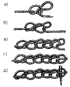 На укорачиваемом тросе последовательно делают две колышки (рис. 31 а). Внутреннюю часть правой колышки проводят в левую колышку, а внутреннюю часть левой колышки - в правую (рис. 31 б, в).