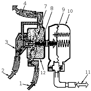 Рис. 27. Принципиальная схема устройства комбинированного бензомаслонасоса «VRO». 1 — бензошланг от бака; 2 — маслопровод от бака; 3 — масляный насос; 4 — смесь бензина с маслом, поступающая к карбюратору; 5 — шток, соединяющий диафрагму бензонасоса с поршнем 6; 6 — «плавающий» поршень маслонасоса; 7 — смесительная камера; 8 — шток бензонасоса; 9 — приводная диафрагма (мембрана); 10 — привод насоса, работающий от пульсации давления в картере; 11 — шланг, соединяющий камеру 10 с картером; 12 — бензонасос.