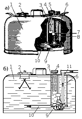 Рис. 28. Топливный бак «Аutoblend» (а) и схема его работы (б). 1 — бензобак емкостью 20,3 л; 2 — горловина для заправки бензином; 3 — маслофильтр; 4 — горловина для заправки маслам; 5 — индикатор уровня масла; 6 — резервуар для масла; 7— поплавок индикатора уровня; 8 — привод запорного клапана, работающий от поплавка; 9 — заборчик масла и смеситель бензина с маслом; 10 — заборник бензина; 11 — смесь бензина с маслом.