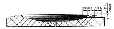 Острым ножом по линейке делаются надрезы параллельно кромке и снимаются полосы стеклоткани; при этом ширина полоски на каждом последующем слое уменьшается на 30 мм (рис. 14)