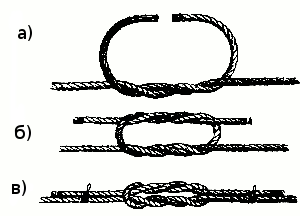 После этого узел затягивают, а концы закрепляют шкимушгаром или тонким линем (рис. 3 в).