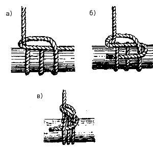 Концом троса охватывают предмет тремя шлагами затем ходовой конец обносят вокруг троса и проводят под самого себя (рис. 43 а), и под первый шлаг узла (рис. 43 б). Затянутый узел показан на рис. 43 в.