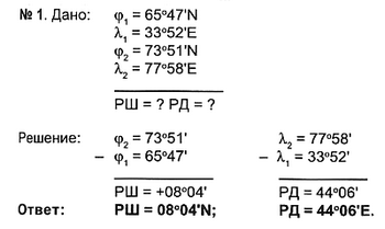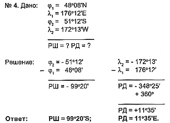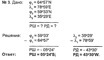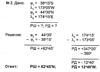 При решении задач по определению РШ и РД необходимо знать, что северные широты и восточные долготы имеют знак "+", а южные широты и западные долготы. При положительном значении "+" РШ считается к N, РД к Е, а при отрицательном значении "-" РШ считается к S, РД к W.