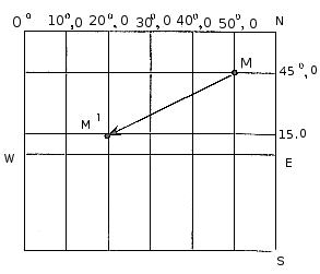В пункте отхода точка М (рис. 162) судно имело координаты φ = 45° ,0 N и λ1 = 50°,0 Е, а в пункте прихода точка М1: φ2 = 15°,0 N и φ2 = 20°,0 Е. Таким образом в данном случае: РШ = φ2 - φ1 = 15°,0 - 45°,0 = - 30°,0 = 30°,0 к S; PД = λ2-λ1= 20°,0 - 50°,0 = - 30°,0 = 30° к W.