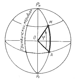 Широтой называется угол между плоскостью экватора и радиусом, проведенным из центра Земли в заданную точку на земной поверхности (рис. 157).