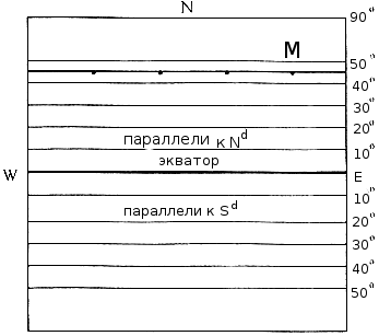 В связи с тем, что судоводитель работает с навигационной картой, на которой параллели изображены прямыми линиями, параллельными экватору (рис. 158), найдем на условной карте параллель со значением 45°,0 N, проведем ее и увидим, что любая точка на этой параллели будет иметь значение (φ= 45°,0 N. Таким образом, зная значение широты φ, определить истинное место нахождения данной точки (судна) на карте нельзя, можно только утверждать, что эта точка находится где-то на параллели с φ= 45°,0 N.