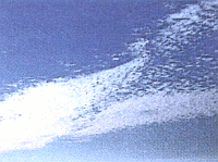 Сплошной волнисто-образный покров с более светлыми промежутками между волнами. Выше 600 м слоисто-кучевые облака серого цвета с просветами |