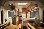 Основа концепции дизайна автодома – его практичное и функциональное использование. Комфортабельные сиденья водителя и пассажира можно развернуть к столовоой группе. Раскладной стол имеет несколько вариаций компоновки, а под ним расположен люк в гараж, который можно использовать как из автодома, так и снаружи. Рядом с кухней расположен высокий гардеробный шкаф с подсветкой. В небольшой кухне есть все необходимое: вместительные навесные шкафы, 2-конфорочная варочная панель, четыре удобных ящика с выдвижным механизмом внизу, оптимальная рабочая поверхность, приставной столик, мойка, холодильник. В ванной комнате, расположенной за дверью-гармошкой, также продумано множество полок для хранения ванных принадлежностей. Хромированный смеситель оборудован выдвижной насадкой – рассеивателем, которая служит душем. Широкое зеркало с подсветкой и люк в ванной комнате визуально расширяют пространство. За поддержание комфортной температуры в автодоме ответственна дизельная система отопления марки WEBASTO 6 кВт.