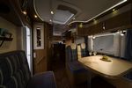 Уютная гостиная располагает к отдыху. 19-дюймовая ЖК панель со встроенными динамиками, размещенная на вращающейся и поворотной консоли, позволяет насладиться просмотром любимой телепередачи из любой точки автодома. Ванная комната снабжена отдельной душевой кабиной. Объём бака для чистой воды – от 90 до 120 литров в зависимости от модели автодома. Бак для использованной воды, так же как и все коммуникации, изолирован и подогревается, а сливной кран снабжён специальным клапаном с тефлоновым покрытием и расположен так, что в холодное время года вода при сливе не замерзает. Благодаря люку, расположенному на потолке, ванная комната хорошо проветривается. Кроме того, это даёт дополнительное освещение. Высококачественные краны с керамическими уплотнителями прослужат очень долго. Практичные шкафчики и полочки, зеркала и хорошее освещение – комфортные составляющие общей концепции ванной комнаты.