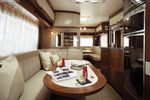 Внешний образ жилых прицепов Hymer S-класса ярко говорит об эксклюзивности и неповторимости. Серебристый цвет каравана стильно дополнен дизайнерскими элементами бордово-красного и светло-серого цветов. Плавные округлые формы каравана – достоинство дорогой технологии PUAL. Изящные задние фонари подчёркнуты чёрным бампером.В кухне продумана каждая мелочь. Место под варочной панелью с тремя конфорками занято шкафчиками для кухонной утвари. Нижние шкафы снабжены выдвижными ящиками с роликовым механизмом, которые оснащены решётками для сушки белья. Большая раковина встроена в столешницу, тёмный цвет гранита которой, контрастируя со светлыми стенами и кожаными вставками на дверцах шкафов, подчёркивает необычные плавные формы мебели в тоне Noce Bergamo. Округлые линии мебели повторяются навесными шкафами с вмонтированными в них светильниками. Оригинальные хромированные ручки служат неброским украшением этой функциональной мебели.