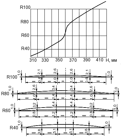 Рис. 44. График распределения шага и толщины сечений лопастей винта.