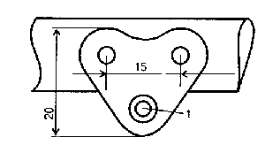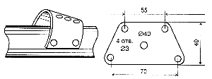 После отвердевания банку опиливают. Затем в наиболее выпуклом месте снизу приклепывают подпятник - квадрат из дюраля (50x50x1 мм), формованный молотком по профилю банки. В середине подпятника просверливают отверстие диаметром 4 мм. Сверху банку обрезают (рис. 53). Из обрезков прокатанной трубы диаметром 18 мм делаются 4 крючка для фиксации тросиковых упоров на передней банке (рис. 54). Банка крепится к кильсону на стойке (рис. 55), которая выгибается из дюраля.