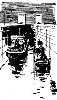 Шлюз - это гидротехническое сооружение для перемещения судов с одного уровня воды на другой (рис. 146). Акватория выше шлюза называется верхним бьефом, ниже шлюза - нижним бьефом. Разность уровней воды этих бьефов называется подпорным уровнем воды. Принципиальная схема для шлюзов (рис. 145) практически одинакова с небольшими отличиями.