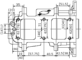 Рис. 5. Координаты крепежных шпилек и отверстий в картерах двигателей моторов "Вихрь" различных моделей. Размеры без скобок относятся к картеру двигателя "Вихрь-М", размеры в круглых скобках — двигателя "Вихрь", в квадратных скобках — "Вихрь-30"