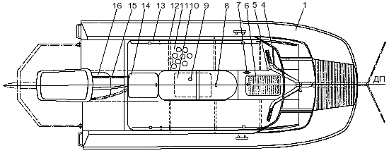 - фанерный пайол; 12 - подуключена; 13 - уложенное вдоль весло; 14 - крышка