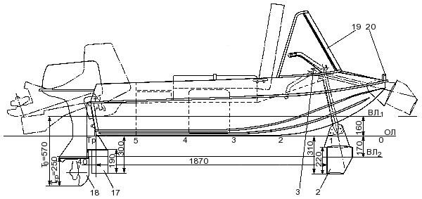 Координаты ЦТ при полном водоизмещении, м: по длине от транца по высоте от ОЛ |