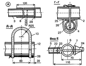 50x2,5; длина 80 мм; 2 - центральная балка - кормовая секция, труба 45x1,5,