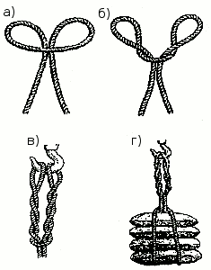 Морской узел «кошачьи лапки» применяют для уменьшения длины стропа (рис. 27 г). Следует иметь в виду, что этот узел позволяет сравнительно немного уменьшить длину стропа.