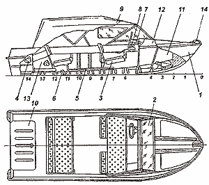 стекло; 3 - мягкие сиденья; 4 - блоки из пенопласта; 5 - пайол; 6 - рундук; 7 -