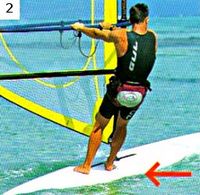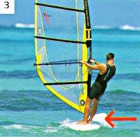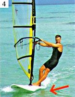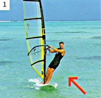 1. Против ветра. На самом деле ни одно парусное судно идти прямо против ветра не может. Поэтому речь идет о крутом бейдевинде, под углом приблизительно в 45° относительно ветра. Парус наклонен к корме и добран. Тело расположено поперек доски; ступни толкают ее вбок, пятки находятся с наветренной стороны. Для того чтобы доску не сносило вбок, шверт следует опустить.