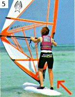 5. Фордевинд. Ветер дует прямо в корму, парус повернут под углом 90° к доске, затрудняя обзор, Тяга теперь направляется вверх и вниз, а не в сторону от доски. Для противодействия тяге отклоняйтесь прямо к корме. При этом обе ноги смотрят вперед и располагаются по сторонам от центральной линии, чтобы контролировать поперечный наклон. Продольный наклон контролируется передвижением ног назад и вперед. При слабом ветре и на волнах доску ощутимо шатает. Фордевинд — наиболее нестабильный курс.