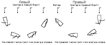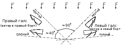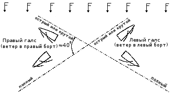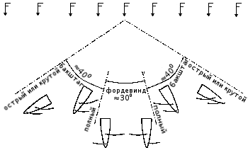 Примечание: Выражение «гоночный бейдевинд» означает: выгодный бейдевинд, позволяющий максимально быстро приближаться к цели, находящейся на ветру. «Гоночный бейдевинд» лежит между крутым и полным бейдевиндом. Выбор за рулевым.