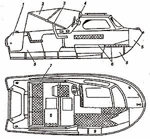 7 - кормовой диван; 8 - съемный столик; 9 - полка