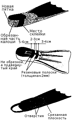 Частенько случается так, что подходящие по размеру ласты имеют узкую калошу. Расширить ее можно двумя способами. Первый (если калоша из резины) заключается в том, что калоша разрезается сверху, а потом разрез раздвигается и заклеивается резиновой полосой. Полоса эта не должна иметь обрезных торцов, так как может легко порваться по малейшему надрезу, и приклеивается таким образом, чтобы между разрезанными торцами калоши оставалось необходимое вам расстояние.