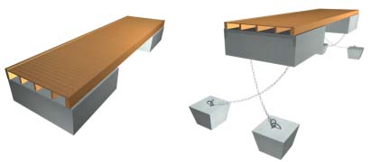 Деревянные понтоны на бетонных поплавках могут с успехом служить основой для создания плавучих конструкций самого разнообразного назначения.