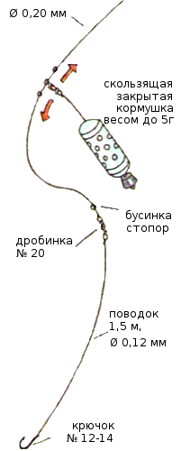 Рыбалка бывает удачной и тогда, когда ловят в воде с течением на глубине в 6-7 м, при этом из кормушки постоянно выходит шлейф из вещества подкормки. Рыболовы-спортсмены, пользуясь этим способом, получают очень большие уловы.