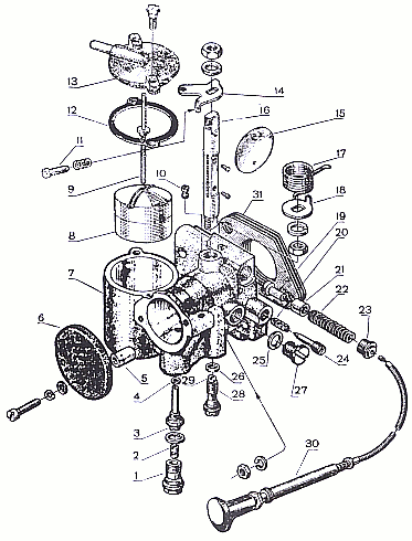 Рис. 112. Карбюратор: 1 - корпус главного жиклера; 2 - главный жиклер; 3 - распылитель; 4 - прокладка распылителя; 5 - втулка; 6 - крышка; 7 - корпус карбюратора; 8 - поплавок; 9 - шток; 10 - жиклер воздуха; 11 - винт упорный с пружиной; 12 - прокладка; 13 - крышка поплавковой камеры; 14 - рычаг; 15 - заслонка; 16 - ось заслонки; 17 - пружина возвратная; 18 - шайба упорная; 19 - клапан; 20 - пружина иглы качества; 21 - втулка; 22 - пружина; 23 - пробка; 24 - игла качества; 25 - прокладка; 26 - прокладка штуцера; 27 - пробка; 28 - корпус жиклера; 29 - жиклер; 30 - трос; 31 — прокладка.