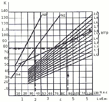 Все это заставляет конструкторов маломерных судов и органы надзора за безопасностью на воде ограничивать мощность двигателя (ПЛМ), устанавливаемого на судно. Максимально допустимую мощность подвесных моторов и стационарных двигателей, устанавливаемых на глиссирующих маломерных судах, определяют по графику, приведенному в обязательном приложении 3 ГОСТ 19105-79 (рис. 119), в зависимости от коэффициента К, вычисляемого по формуле: