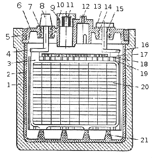 Рис. 94. Свинцовый аккумулятор: 1 - бак; 2 - кислотостойкая вставка; 3 и 17 - ушки пластин; 4 и 16 - баретки; 5 - мастика; 6 - крышка; 7 и 14 - свинцовые втулки; 8 и 15 - выводные штыри; 9 - резиновая прокладка; 10 - пробка; 11 - резиновая втулка; 12 - газоотводное отверстие; 13 - межэлементное соединение; 18 - предохранительный щиток; 19 - сепаратор; 20 - пластина; 21 - ребро бака