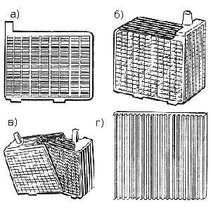 Рис. 95. Детали аккумулятора: а - решетка пластины; б - полублок; в - блок пластин с сепараторами; г - сепаратор