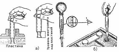 Здесь мы рассмотрим только первый способ, т.к. он имеет, на наш взгляд, ряд неоспоримых преимуществ: короткое время заряда - в течение первых 4-5 часов батарея заряжается на 91 95% из-за большой величины зарядного тока в этот период; по мере заряда батареи сила тока автоматически (не требуется регулировочных реостатов) уменьшается, не вызывая перезаряда и, тем самым, разрушения активной массы пластин. Кстати, этот метод применяется на автомобильных двигателях. Для зарядки батарея, с предварительно открытыми пробками банок аккуц ляторов и установленным необходимым уровнем электролита, подключается к источнику постоянного тока (зарядному устройству) с напряжением 12-14 вольт. Проверка уровня электролита (рис. 96) производится стеклянной трубочкой длиной 100-150 мм, диаметром 4-6 мм, который следует опустить в бак до упора в пластины, затем, зажав верхнее отверстие, вынуть и убедиться что уровень электролита 10-15 мм.
